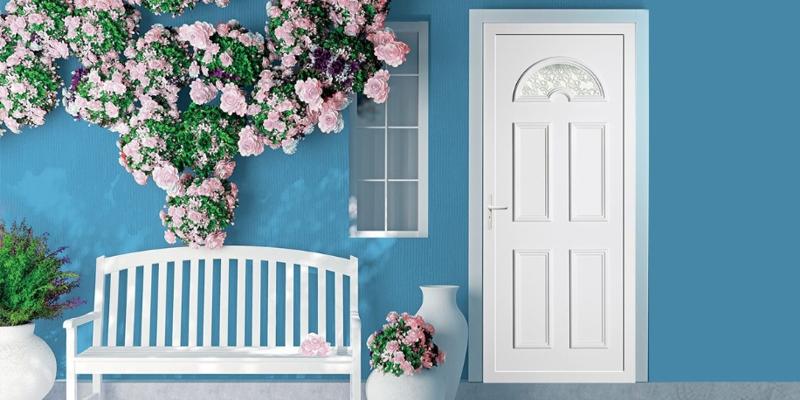 Porte d''entrée PVC à la française de couleur blanche Ral 9010.